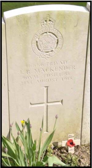 Enlisted in Bury St Edmunds. Longueness Cemetery is on the outskirts of St Omer, which apart from being the HQ of the BEF, was a very important hospital centre during the war. The Bury Free Press of 7th September 1918 reported:- LAKENHEATH SOLDIER'S SACRIFICE - DIES OF WOUNDS AFTER OPERATION Among the casualties recently reported at Lakenheath is the death of a well-known young man, Private John Robert Mackinder (sic), the sad news having reached his wife, Mrs. Mackinder of Anchor Lane.He was the son of Mr. and Mrs. R. Mackinder, Mill Road, Lakenheath and was in the Royal Fusiliers. He was 23, and leave his widow with two children. He enlisted in 1916, was home on leave last October, and was expecting to be home again shortly. The Sister in Charge of the No.1 Australian Casualty Clearing Station, writing to Mrs. Mackinder says:-"It is with deepest sympathy that I wire to tell you of your husband's death. Private J, Mackinder was admitted to this station on 20/8/1918 with a severe wound in his thigh. After he had sufficiently rested (because he was in a very exhausted condition when he was admitted) he was taken to the operating theatre and was given a blood transfusion, and it was found necessary to amputate his leg. But he did not improve, and died on 21/8/18. Everything possible was done for him." The Chaplain writes:" In spite of all the efforts of the doctors and nurses he passed peacefully away. His body was laid to rest in a cemetery and I read the Church of England service at the graveside." |