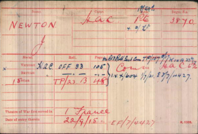 Enlisted in 16th June 1915. Sent overseas on 19th September 1915, commissioned 7th December 1916. On 23rd April 1917 they were near Bailleul and Gavrelle. On the night of 23/24th April "C" and "D" Coy (Lt Newton was actually "B" Coy attached to "D") relieved "A" and "B" Companies successfully. When dawn broke "D" Coy, occupying a forward post in a demolished trench, came under sniper fire and Lt Newton and Sgt Nicole were killed. The company became cut off and all became casualties. |