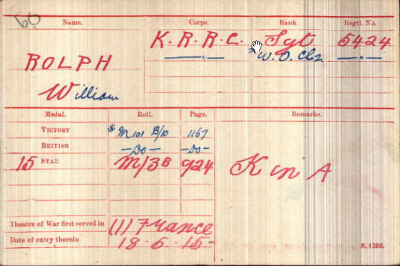 chest 32 1/2 to 35" (82.6 to 88.9 cm) Much of his documentation is baldy damaged, but this much seems clear:- Promoted Lance Corporal 7/7/1905, reverted due to misconduct 1906, promoted again to L/Cpl 3/10/1908. On 19/2/1911 he extended his service to 12 years in the colours. and was promoted full corporal 14/3/1912. He seems to have extended his service, as a Sergeant to 21 years on 9/9/1914. He was with the 4th battalion when posted first to France on 18th May 1915. Presumably he was on instructor duties in UK until then. He was returned to UK 3/10/1915 first to Depot Detail, then 6th Battalion and then with the 1st battalion he returned to France on 18th December 1916. Promoted Company Sergeant Major (Warrant Officer 2nd class) on 23rd March 1917 he was killed in action on 29th April 1917. That day the battalion were in the front line, east of Bailleul. The War diary had:- 4am - Battn - less "D" Coy - with troops on either flack attacked and captured the OPPY LINE from B.18.d.5.7.to B.18.b.2.8l The troops on our right failed to get in and the right flank was consequently exposed. At about 5 am th enemy commenced to bomb the right flank and fighting continued until about 10 an when owing to a lack of bombs and SAA (small arms ammunition) we were forced to give way and withdrew to the jumping off trench via SUNKEN ROAD in B.18.G. "C" Coy on the left withdrew northwards along the OPPY LINE and placed themselves under the orders of the 1th R.F. establishing a block at about B.12.d.14, taking with them three captured machine Guns. The enemy shelled our front line heavily throughout the remainder of the day and there was a great deal of M.G. and rifle fire. Patrols were sent out at dusk and found OPPY LINE still held by the enemy. 11 pm The Battn was relieved by the 13/ E Yorks and returned to the trenches E of ROCLINCOURT through a barrage of gas shells. without sustaining any casualties. About 70 prisoners and 3 machine guns were captured by the Battn during the day and severe casualties were inflicted on the enemy. Casualties: Officers killed 2/Lt MA SIMON; wounded and missing 2/Lt H A GIBBS, 2/Lt EC READY; wounded Capt VG STOKES, Capt EL JERWOOD, 2.Lt AP AVELINE, 2/Lt GM ARCHDALE..Other ranks Killed 15, wounded 89, missing 47. Total 151 casualties out of the 250 who actually attacked. The Bury Free Press of 26th May 1917 reported:- LAKENHEATH CO-SGT-MAJOR KILLED The news has been sent to Lakenheath by Mrs.Rolph, wife of Coy.-Sergt-Major W.R.Rolph, stating that she had received letters from officers who informed her that her husband was buried in a trench and killed, in France, on April 30th or May 1st. He was in the 1st Royal Rifle Brigade, and had been for the past fourteen years: when he first enlisted he joined that Regiment. He was home from France suffering with malaria fever, but returned on December 17th last. Had he lived until last Tuesday he would have celebrated his 32nd birthday. He was a native of he parish, the youngest son of the late Mr. and Mrs. Lewis Rolph. |