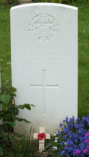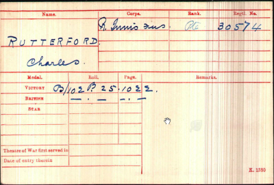 1901 census... Aged 3, he was living at High Street,Lakenheath with his father- Alfred RUTTERFORD [31] a woodman/labourer; mother- Elizabeth (née MATTHEWS ?) [32]; sister- Dorothy C [2]; sister- Emily V [4 months]. All were born in Lakenheath. 1911 census...Aged 13, farm labourer, living at High Street,Lakenheath with his parents, sister Dorthy E and Emily V and new siblings; sister Alice B [8]; brothers William J [7] and Harold A [5] and sister Mollie B [3], all Lakenheath born. One sibling had died |