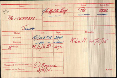 1901 census...Aged 9, he was living at Sandpits, Lakenheath with his father- Henry RUTTERFORD [57] farm labourer; mother- Emma (née RUTTERFORD) [52]; sister- Olive [18] and sister- Bertha [12]. All were born in Lakenheath. 1911 census...Aged 19 , labourer, he was lodging at Lode Street, Brandon with Henry and Mary Ann Dyer. He was entered in the census as KUTTERFORD. His parents, sisters Olive and Bertha and niece Minnie were still at Sandpits, Lakenheath. It is recorded that 2 of his 7 siblings had died. After Jacob's death the family address was Vine Cottage, Station Road, Lakenheath |