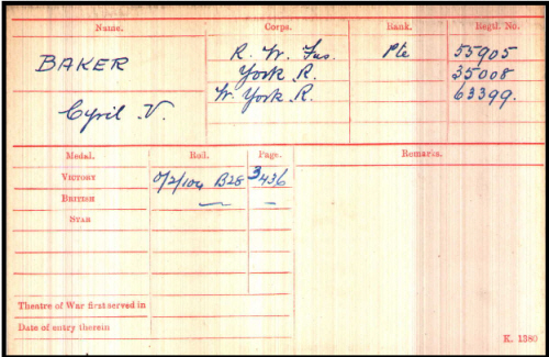 He enlisted in Braintree. The memorial plaque has him in the Royal Welsh Fusiliers, but that was only one of the regiments he had served in. He died in the West Yorkshires. Quite amazing, his records survive in two regiments and he has a large entry in Du Ruvigny. On 14th February 1916, living at 36 Mount Road, Braintree, he attested and was placed on the Reserves. He gave his age as 18 years 9 months, a weigher of metal, 5 feet 3 inches (160 cm) tall, weighing 118 lbs (53.7 kg), chest 34" to 36" (86.4 to 91.4 cm). He was mobilised into the 3rd Essex on 26th October, and on posing to the BEF on 24th January 1917 joined the 1st Essex. Transferred to the 15th Royal Welsh Fusiliers on 10th February 1917, the Yorkshire Regiment on 1st April 1918 and then to the 2nd West Yorkshire regiment on 17th June 1918. On 23rd August 1918 he was gassed and admitted to 26 Field Ambulance who sent him down the line (gas-yellow) to 7 Casualty Clearing Station who passed him on the No 2 Australian General Hospital who diagnosed mustard gas. By 3rd September he was at No 12 Convalescent and posted to depot on 13th, returning to his unit on 15th September. When his mother, at the Rising Sun, Little Wratting received his effect, just photos and a religious book she immediately enquired as to where the rest of his things were, he would always have carried letter, money, wallet, a ring and pocket book. Any reply is not with his records. On the Living Relative form in August 1919 his mother ( now at Wratting Road, Haverhill), recorded just herself, his brother Walter V [49] and his sister Dorothy. They must be the siblings previously recorded as Walter and Dorris. His entry in Du Ruvigny's "Roll of Honour" reads BAKER, CYRIL VICTOR_ Private.No 63399, 2nd Battn.(14th Foot) the Prince of Wales'Own (West Yorkshire Regt.) s.of the late Walter Herbert Baker , by his wife, Lottie (Wraithing Road, Haverhill), dau.of Harry Bantick, of Ixworth .co.Suffolk; born Great Barton, co.Suffolk 21 May 1897;educ. Stansfield C.C.School ; was a baker: on the outbreak of war, 4 Aug 1914, being too young to enlist he became a Munition Worker; Joined the Essex Regt.26 Oct.1916; was transferred to the 15th Royal Welsh Fusiliers in Jan.1917; to the 13th Yorkshire Regt in April 1918 and subsequently to the 2nd West Yorkshire Regt; served with the Expeditionary Force in France and Flanders from Jan 1917 and was killed in action north east of Beauvois and north of Cawdry 7 Oct.1918. Buried where he fell. His Commanding Officer wrote:" I more than regret his death, as he was one of the best men I had in my platoon, a good man and well liked by all ranks". He was awarded a certificate for distinguished conduct in the field which stated;"During the attack on 31 July 1917, when employed as Headquarters runner, this man did splendid work, going forward on many occasions with messages under heavy machine gun fire. Throughout he displayed the utmost cheerfulness and disregard of danger".unm. This record cannot be correct regarding the place of his death (SE of Cambrai) since the battalion were 40 miles away NE of Arras, heading towards Douai Fresnes being Fresnes les Montauban, unless he was attached to another unit. The war diary has :- Greenland Hill Sector -7th Oct - The battn took part in the attack on the FRESNES-ROUVROY line. Dispositions as follows: A Coy on left, B Coy in centre, D Coy on right and C Coy in Reserve. The Battn attacked at 5 am in conjunction with the 2nd Middlesex on the right and the 2nd Devons on the left. A magnificent artillery barrage was put down and all objectives were quickly reached with but little opposition, and very few casualties. A number of prisoners were taken, who all appeared very pleased to be captured. After the attack posts were established round about GLOSTER WOOD and in FRESNES village. CWGC records show 5 killed, 2 buried near Arras and three named on the Vis-en-Artois memorial. Cyril's grave was reported at Mont St Elois on the memorial, NW of Arras, but must have been lost later for his name to be on the Vis-en-Artois memorial.
