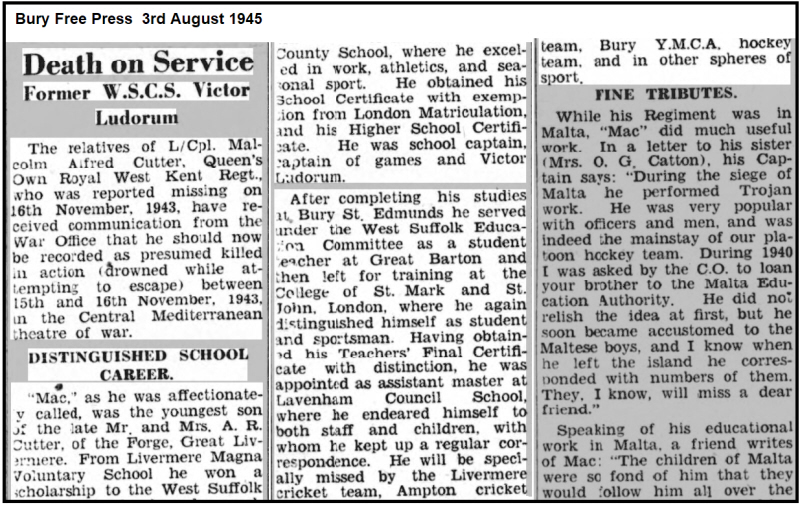 Malcolm Alfred CUTTER was born on 25th January 1917 in Great Livermere (Bury St Edmunds Q1-1917 4A:1521), the son of Arthur Raymond and Kate Elizabeth CUTTER (née DENT). His mother died in 1935 In the 1939 register Malcolm (an assistant school master) was at The Forge, Great Livermere with his widower father Arthur R. CUTTER [12-5-1872] and James and Olive CATTON. There are 2 closed records. |