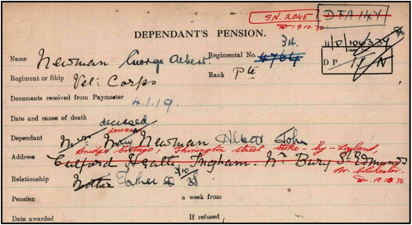 1901 census...Aged 9, he was at Meadow Cottages, Lackford with his father Albert NEWMAN [30] stockman, born Dalham; his mother Mary A [28] born Denham; sister Martha T [8] born Dalham; brothers Arthur F [4] born Dalham, Edward H [2] born Denham. 1911 census...Aged 19 he may be the George Newman who was at Stanhope Lines, Aldershot, albeit in Suffolk Regiment and recorded as born Chevington. His parents were at Lackford with sister Edith [8] born Lackford; brothers Arthur, Edward and twins Sidney and Stanley [1] born Lackford. The George Newman, registered death Cambridge Q3-1915 3B:484, was born 1891 As can be seen from the pension card below, his parents were at Culford Heath, Ingham, untl his mother died, when father moved to Bridge Cottage, Stoke by Nayland. |