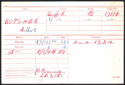 Albert Butcher was born in 1886 in Burnt Fen (Mildenhall Q4-1886 4A:702), son of Jacob and Mary Ragan BUTCHER (née GOTOBED).
