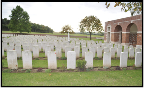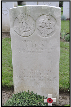Richard enlisted in Mildenhall. The war diary, after complaining about our own heavy artillery dropping "shorts" on our trenches every day, causing casualties, went on for the 21st to say :- Front line - A quiet night compared with others. 14 N.F. dug a trench from N.32.d.7.3. to N.32.a.central which we patrolled that night, the enemy shelling on our front line very heavy. CWGC records 4 of the 10th Yorkshire killed. approx position of trench mentioned above photo: Rodney Gibson and commemorated on the war memorial in Beck Row click here to go to the Commonwealth War Graves Commission website for full cemetery/memorial details |