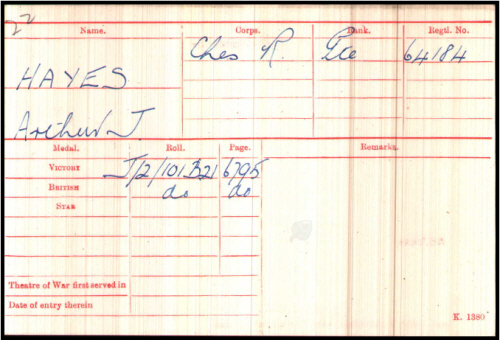 Arthur John HAYES was born in Charlton, Northants on 30th May 1878,(Brackley Q3-1878 3B:1) son of Harry Hawkins and Sarah Ann HAYES (née HILL).