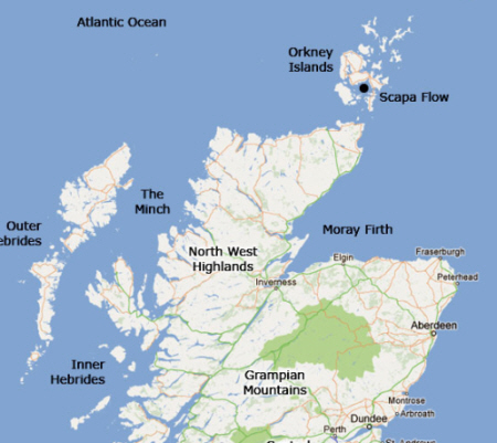 On 9th October she sailed to try and intercept the German Battlecruiser GNEISENAU and the cruiser KÖLN. Bad weather made her return to Scapa Flow on the 11th. Most of the fleet was moved out of Scapa Flow as an attack by the German air force was expected. Royal Oak, due to her age and the hopes that her anti aircraft guns would boost the defences was left there, anchored in the north east corner. At 01:04 on the 14th a torpedo, one of 3 fired by U-47 hit her on her starboard side near the anchor chains. Then at 01:16 a further two torpedoes, from another spread of three, hit her amidships, seemingly igniting cordite charges in a magazine. and at 01:29 she rolled over and sank. 420 men survived, but 833 perished. The sinking ensured that the name of U-boat captain Günther Prien of U-47 would always be recognised in the naval history of WW2. |