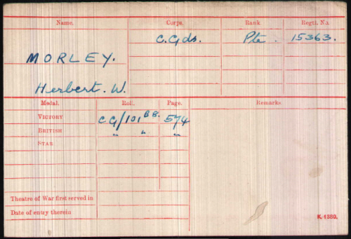 1891 census...Aged 3, he was at Cottage, Plough Yard, West Row with his father Charles MORLEY [46] engine driver (portable); his mother Joanne [46]; brothers Leonard [28], Thomas [22] and Robert [20] all farm labourers, and Walter [6]; sister Mahala [9]. All recorded as born in Mildenhall. 1901 census...Aged 13, farm labourer, he was still at Plough Yard with his parents; brothers Leonard (horsekeeper) and Walter (farm labourer), sister Mahala and niece Violet MORLEY [5] 1911 census... Aged 22, a laundry vanman, he was boarding with Thomas and Jane JACKSON, at 12 Beattie Terrace, Blackhill, Co.Durham. His widowed mother and brother Leonard were still in West Row. His father had died in 1907. He married Sarah Elizabeth BATY (Lanchester Q2-1913 10a:546), later of 3 Buckham St, Blackfyne, Blackhill, Co.Durham. Their daughter Violet M. was born Lanchester in 1914 No pension card found |