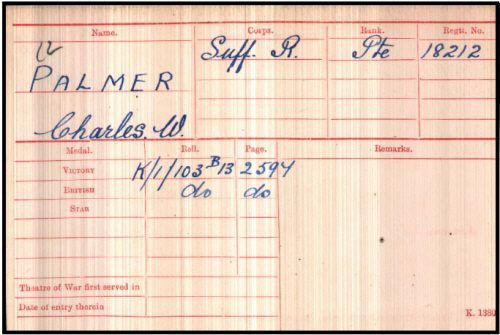 Charles William Palmer was born in Mildenhall on 24th September 1883,(Mildenhall Q4-1883 4A:675) son of Ebenezer and Emily Mary Ann PALMER (née FINCHAM). Yet another case of how a differing order of given names can cause much confusion. Given the details from Du Ruvigny, this has to be the right man. He is William on Beck Row memorial and was also W Palmer on Mildenhall memorial originally 1891 census...Aged 7, he was at Beck Road with his father Ebenezer PALMER [29] farm labourer; his mother Emily M [29] and great aunt Matilda DENNIS [63]. All were born in Mildenhall. 1901 census...Aged 17, a labourer, he was at Kenny Hill Road, "part of Mildenhall called West Row", with his parents (father now a horse keeper on farm) ; brother John [7](Ebenezer John); sisters Violet [4] and Olive M [1] and great Aunt Matilda DENNIS. His new siblings were all born in Mildenhall. 1911 census... Aged 27, a farm labourer, he was at Beck Row with his parents; brothers John (farm labourer) and Charles H [9] born Mildenhall, and sister Olive May. The naming of a brother as Charles H may be a reason for William coming into use as his first name and Henry for the other, a not uncommon happening. |