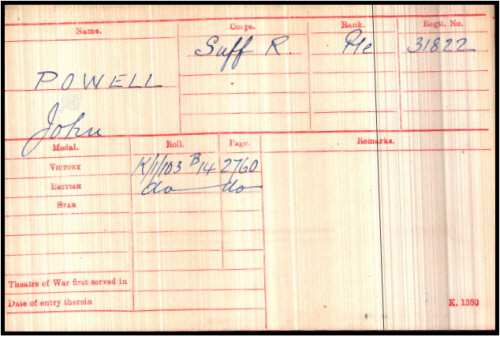 Enlisted in Newmarket. His battalion that day were in the front line trenches near Mazingarbe. The war diary says 2 killed, 2 wounded. It was a period of little action. CWGC have 3 killed. The Bury Free Press of 27th October added to the information:- HOLYWELL ROW SOLDIER'S GRAVE IN FRANCE Mrs Powell, Holywell Row, Mildenhall received an official notification, which stated that her husband, Prvt John Powell, 9th Suffolk Regiment, fell in battle on May 25th, but received no further information. Neither Chaplain, officer or comrade's letter has reached her, if a letter was written. A further official intimation has been received that the burial of her husband was at the Philosophe British Cemetery, one mile from Vermelles. Mrs. Powell will be thankful to hear from anyone who can give her any information of her husband's death.