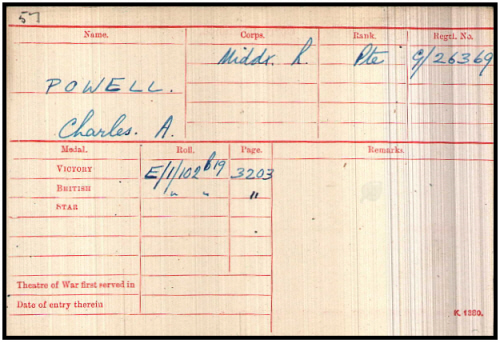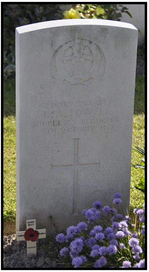 He enlisted in Bury St.Edmunds, initially in the 4th Battalion, Middlesex Regiment The 3rd/10th Battalion were a Territorial Battalion and this was their first big battle of the war. They were in the Langemark -Poelcappelle area, the Broodseinde Ridge offensive and it had rained heavily on 1st and 2nd October. The battalion war diary:- "On the night of 3/4 Oct the battalion left camp to take part in the attack NE of LANGEMARK on the day of 4 Oct and moved to their new HQ at AU BON GITE and was detailed as the counter attack battalion. The battalion was in support to 2nd Seaforths who were the attacking battalion, the two forward Coys B and C coming under the orders of the OC 2nd Seaforths from zero hour on the 4/10/17. 2 Platoons of B Coy being detailed as left flank guards and to keep in touch with the Dublin Fusiliers. The attack was made on a battalion front and the 10th Brigade objective was roughly 19 metres hill map reference BRUEMBEEK 1/10,000 V.18.0 The starting point was 100 yds north of EAGLE TRENCH, the 11th Brigade were on our right and the 86th Brigade on our left. The battalion arrived at the piont of assembly without incident. At 6 am (zero hour) on the 4.10.17 our artillery barrage started and the two leading Coys B and C moved forward to EAGLE TRENCH followed by D and A Coys about 8 am. B.H.Q started to move forward to EAGLE TRENCH and had not gone more than 300 yds before the C.O. was knocked down by a splinter from a shell and Lt H.K Smith, the battalion Intelligence Officer was wounded in the wrist by a shell. B.H.Q found it impossible to move forward owing to the intense barrage. After the CO had recovered from the knock out blow BHQ moved to EAGLE TRENCH where the OC Seaforths had returned from KANGAROO TRENCH that trench owing to our barrage being non ext. {?} OC Seaforth informed CO 3/10 Middlesex that the whole of his battalion had been absorbed in the attack. The enemy kept an intense barrage on EAGLE TRENCH 4th and 5th Oct and it was almost impossible to move, a lot of stretcher cases were killed here coming down with their bearers. At about 2:30 pm the 4th, the CO required reinforcements as messages were continually received from the Company Commanders that their left was in the air, our left having failed to come up to the line. The 1st Royal Warwicks arrived at about 4pm on 4/10./17 and filled up the gap in the line with the 2nd line of the 11th Brigade and later pushed forward and got in touch with the remainder of the 2nd Seaforths and 3/10 Middlesex. " The battalion went into action with 30 Officers and 492 other ranks, but on 4th/5th October they had suffered 12 officer casualties and 365 other ranks. According to CWGC this attack had cost the 3rd/10th Middlesex 85 killed on the 4th October, Charles Powell was one of only 16 who have identified graves, the rest are named on the Tyne Cot Memorial The Bury free Press of 2nd February 1918 reported:- KENNY HILL SOLDIER MISSING We learn that Mr.and Mrs. James Powell,Kenny Hill, Mildenhall are very anxious about their son, 26369 Prvt Chas. A.Powell, 3/10th Middlesex Regiment, who is reported missing from his regiment since Oct.4th 1917. The parents state that since that date no news has been received concerning their son, and they now appeal to any comrade or other person who may know something about him to communicate such information to them.