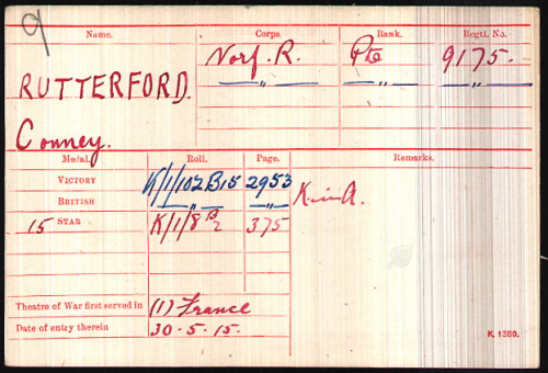 Enlisted in Norwich on 10th August 1914, giving his names as Conney RUTTERFORD, age as 19,( adding 2 years to his age) a labourer, born in Brandon. Next of kin his father James at Black Horse Drove, Littleport. He was 5 feet 6.75 inches (169.5 cm) tall, weighed 115 lbs (52.2 kg), chest 32" to 34.5" (81.3 to 87.6 cm), blue eyed, brown hair, Church of England.