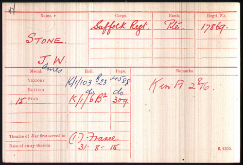 From the war diary:- The battalion were in the INTERMEDIATE LINE to the left of HIGH WOOD on night 1st/2nd August with bombing sorties being carried out during the night. 2nd Aug:- Enemy artillery active during the day. 9:20 pm "D" Coy under Captain HENDRY made a bombing attack along the top of its trench to the LEFT. This resulted in the capture of about 150 yds of GERMAN TRENCH. Owing to the casualties amongst our bombers we were unable to hold the full length of the trench and were forced to withdraw from about 30 yrds, leaving about 120 yds in our possession. A bombing post and barricade was erected and the enemy held back. Captain HENDRY was severely wounded in the attack, 2nd Lt SMITH was wounded by shrapnel about dawn 2nd/3rd. Our casualties in the attack and subsequent bombardment were, in addition to above, 5 OR killed, 25 wounded. CWGC have a known grave for only one of the dead. The Bury Free Press of 2nd September 1916 reported :- WEST ROW SOLDIER KILLED The accompanying portrait is that of James William Stone, 11th Suffolk Regiment, of West Row, who was killed in action on August 2nd last. Deceased enlisted about two years ago, and in due course proceeded to France. He was wounded in the fighting of February of this year. The gallant soldier rejoined his regiment on the 12th June, and as stated above, he was killed on August 2nd, about 2 months resumed fighting. Much sympathy is felt for the bereaved parents of the deceased soldier.