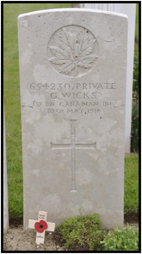 next of kin was his guardian Edmund Morrison He was 5 feet 8 inches (172.7 cm) tall, chest 36.5" to 39.5" (92.7 to 100.3 cm), weight 143lbs (64.9 kg), brown eyed, black hair, Presbyterian. From Canadian Archives RG 150, Accession 1992-93/166, Box 10340 - 44 Item Number:311927. Posed initially to 161st Battalion, he sailed from Halifax per SS "Lapland" on 1st November 1916, arriving Liverpool 11th November and went to Whitley Camp, then joined 4th Canadian Reserve Battalion at Bramshott on 24th February 1918, before going to France on 28th March 1918. Taken ill with suspected sunstroke on 21st May, he was admitted to No 54 Casualty Clearing Station on 26th where he was diagnosed with lobar pneumonia and was dangerously ill, dying on 30th May at 54 C.C.S. His will was in favour of his guardian in Canada, Edmund Morrison. During the fighting in the Spring of 1918 the 54th Casualty Clearing Station came to Aire and the town was, for a while, within 13 kilometres of the German lines. The Bury Free Press of 15th June 1918 reported:- YOUNG SOLDIER DIES IN HOSPITAL A letter written by the sister in charge of one of the hospitals in France, received by Mr.and Mrs.John Butcher, Holywell Row, Mildenhall, informed them that Prvt George Wicks, Canadian Forces was seriously ill suffering from acute pneumonia. A second letter conveyed the sad news that he died on May 27th. He was 23 years of age, and came to the home of Mr. and Mrs. Butcher from a children's home, being with them eight years.. Six years ago he was sent to Canada, and was in the home of a farmer until November 1916, when he enlisted and came to England for his training, being one of 14,000 coming to fight for their country. General regret is felt at his early death. He had visited his former home since being over and was popular with those who knew him. photo: Rodney Gibson photo: Rodney Gibson and on Beck Row war memorial click here to go to the Commonwealth War Graves Commission website for full cemetery/memorial details |