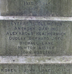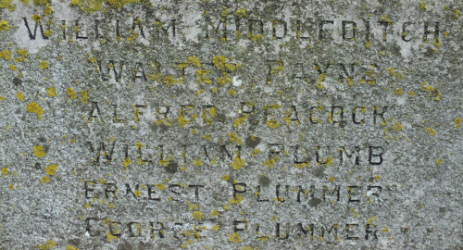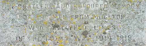 on the topmost step IN GRATEFUL AND HONOURED MEMORY OF THE MEN FROM MOULTON WHO GAVE THEIR LIVES IN THE GREAT WAR 1914-1918 on the centre step JAMES BASSETT ROBERT BRAGG GEORGE CLARKE WALTER CLARKE THOMAS FITCH LANCELOT LANGLEY on the lower step REST ETERNAL GRANT TO THEM O LORD on two faces, on the centre step the rest of the names for the Great War WILLIAM MIDDLEDITCH WALTER PAYNE ALFRED PEACOCK WILLIAM PLUMB ERNEST PLUMMER GEORGE PLUMMER and HARRY PLUMMER PERCY POOLEY FRED PRICE GUY ROBINS ARTHUR HOWE GEORGE RUSSELL on the remaining face,top step 1939-1945 centre step EVERARD COLLINGTON ANTHONY DARLING ALEXANDER HEATHERWICK DUDLEY BERNATO JOEL MICHAEL LANE NEWTON LISTER JOHN RUSEELL bottom step KOREA JOHN LANE 4.1.51