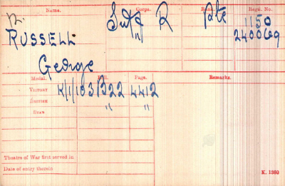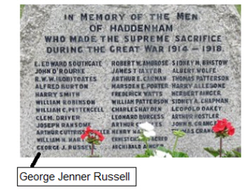 George Jenner Russell was born in 1883 at Sydenham, Kent (Lewisham Q3-1883 1D:1115), son of George and Elizabeth RUSSELL (née JENNER).