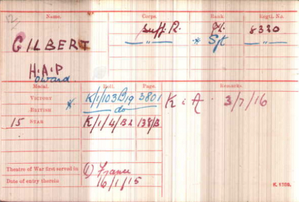 Howard Arthur Purser Gilbert was born on September 12th 1893 at Knettishall, Norfolk (4th qtr 1893 Thetford 4b:363), son of