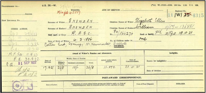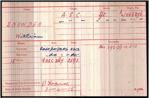 He was discharged from the A.S.C. on 12th May 1916, (K.R. 392 (ix) "Unfitted for the duties of the Corps"). It has so far proved impossible to positively trace his burial. He is not on CWGC or "Solider Died", probably due to discharge before the end of the war and perhaps no one informing the authorities. It seems certain that he was William SNOWDEN aged 45 died on 19th October 1920 at Suffolk District Asylum in Melton, Woodbridge , detailed as a stableman in racing stables living at Cotton End, Exning. A pension card raised on 10-12-1920 has his widow Ellen at The Avenue, Exning. There is another card card for him dying on 19th October 1920, giving his widow as Elizabeth Ellen SNOWDEN of Cotton End, Exning, with one child. His death was attributed to "paralysis of the insane", another term at the time for shell shock or what we would now call post traumatic stress. This is unlikely to satisfy the CWGC even if we could find his Army records, which we cannot. It has so far been impossible to access the records of the asylum |