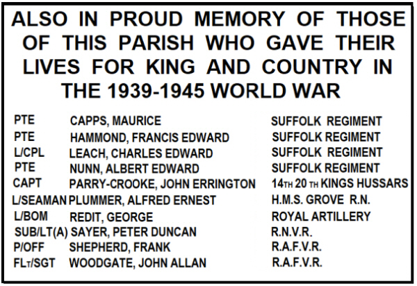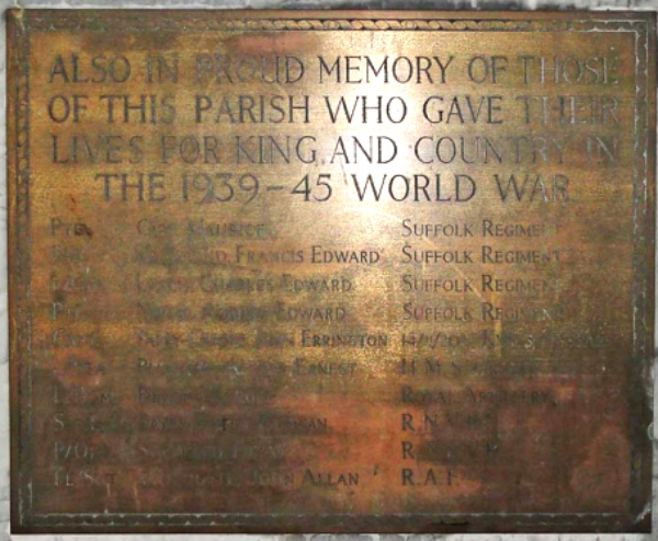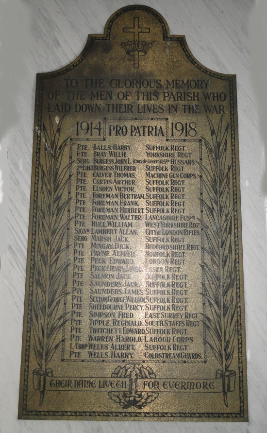 Inside the church of St Mary at Pakenham, on the East wall, the Great War memorial is a brass plaque on a marble base, 1200 cm high x 600 cm