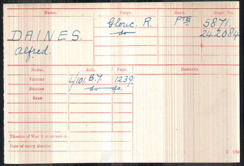 Alfred Daines was born in Ovington, Essex (Risbridge Q3-1888 4A:621), son of Charles and [Sarah] Ann DAINES (née SMEE).