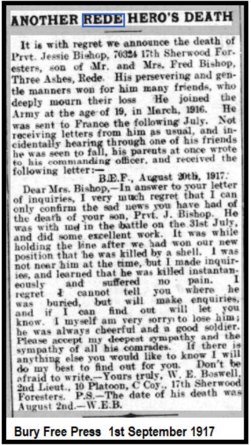 Jesse Bishop was born in 1896 in Brockley(4th qtr 1896 Thingoe 4a:803) son of Frederick and Mary Ann BISHOP (née EVERETT)