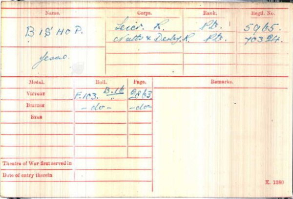 1901 census...Aged 4, he was at Great Green, Brockley with his father Frederick BISHOP [33] farm labourer; his mother Maryann [33]; brothers Fred [13] stockman, Frank [12], Alfred [7] and George [2]. All were born in Brockley. 1911 census...Aged 14, a farm labourer, he was at Three Ashes, Rede with his parents; brothers Alfred (farm labourer) and George William; sisters Lottie May [9] born Brockley and Elizabeth Mary [5] born Rede. On the pension card his mother was at Three Ashes, Rede. |