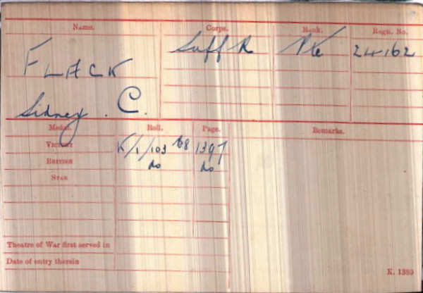 Sidney Charles Flack was born in Rede (1st qtr 1894 Thingoe 4a:776) son of Aaron and Frances FLACK (née POTTER)