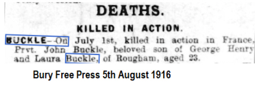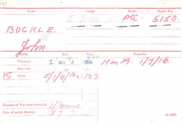John Buckle was born on 17th October 1893 in Rougham (4th qtr Thingoe 4a:718) son of George Henry and Laura BUCKLE (née CATCHPOLE).