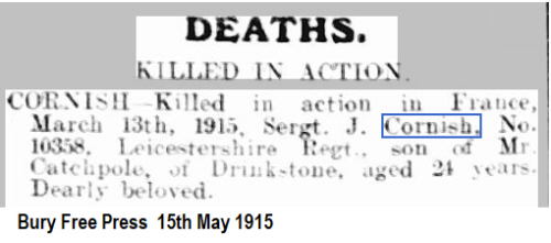 | "Soldiers Died" has him born in Bradfield and resident in Drinkstone. He enlisted in Bury St. Edmunds on 16th February 1909 for six years in the Reserves. He gave his age as 18 years 1 month, single, a gamekeeper born in Bradfield, Suffolk. He was 5 feet 7 inches tall, weighed 125 lbs, chest 31 to 33.5 inches, Church of England. He was placed in the 3rd battalion, Leicestershire Regiment, No,10358. Mobilised on 5th August 1914. Promoted Lance Corporal 5th June 1911 and to Corporal 29th July 1912. In 1919 his Army Form 5080 his full blood relatives were his mother Mildred Sarah CATCHPOLE, nr. Post Office, Drinkstone and brother George CATCHPOLE [24] No.12909 Munster Fusiliers in France; half blood Jeffery CATCHPOLE [18] nr Post Office, Drinkstone. No father named. His next of kin were his mother, brother Archie CORNISH of Newmarket and Alan Frank Cornish of Rougham who may be recorded elsewhere as Jesse Francis or just Francis. Promoted Acting Sergeant at Fort Purbrook on 4th September 1914, posted to BEF 11th December 1914 and promoted Sergeant on 12th December 1914 and posted to the 2nd Battalion. At the beginning of March 1915, the Meerut Division, including the 2nd Leicesters, lined up before the village of Neuve Chapelle, which was held by German forces, half way between Bethune and Lille, south of Armentières. The plan was to form up overnight 9th/10th March. The 2nd Leicesters were in position by 5 am. A sustained artillery bombardment of the German lines was due to begin at 7.30 am to discourage resistance and to cut the enemy's wire. As soon as the barrage was lifted, the advance was to begin. The 2nd Battalion of the Leicesters gave a good account of themselves and remained in the line, in the thick of the battle, until 13th March, when it was relieved. At roll call on 13th March, the first possible since the start of the battle, his name remained unanswered.