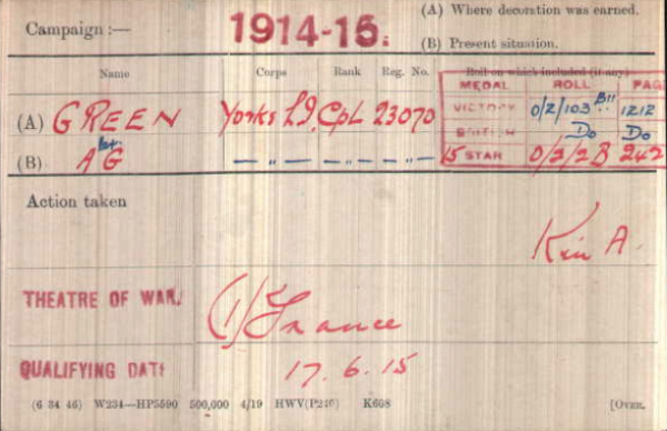 1891 census...Aged 3, he was at Leiston with his father Anthony John GREEN, [32] carpenter, born Australia; his mother Annie [32] born Wickham Market; brothers Frederick [9] born Yoxford and Campbell William [5] born Leiston; sisters Ethel May [8] born Ipswich and Mabel E [7] born Leiston. Sizewell or Leiston, seem to be interchangeable. Family records have their address as Woodbine Cottage, Sizewell, Leiston. . 1901 census...Aged he was at Squires Cottages, Buckendon, Herts with his parents; sisters Ethel, Mabel and Violet [11] born Sizewell, Adelaide [3]born Hertford and Winifred [1] born Hertford; brothers Campbell, Reginald [9] born Sizewell, Austin [7] born Sizewell and Percy [6] born Saxmundham. 1911 census...Aged 22, a grocer's assistant, he was at Seward's Cottages, Buckendon with his parents; sisters Ethel Mary (lady's maid), Mabel Edith, Violet Mildred (school teacher), Adelaide Vie [sic] Beatrice [13], Winifred Hilda Evelyn [11] and Gladys Eleanor Dorothy [9] born Buckendon; brothers Campbell (gardener), Reginald Walter (gardener), Arthur Dudley (apprentice gardener) and Percy Anthony (gardener). His mother had lost one of her 12 children. The pension card has his mother at Wood Cottage, Rougham and later his father at Rose Cottage, Rougham |