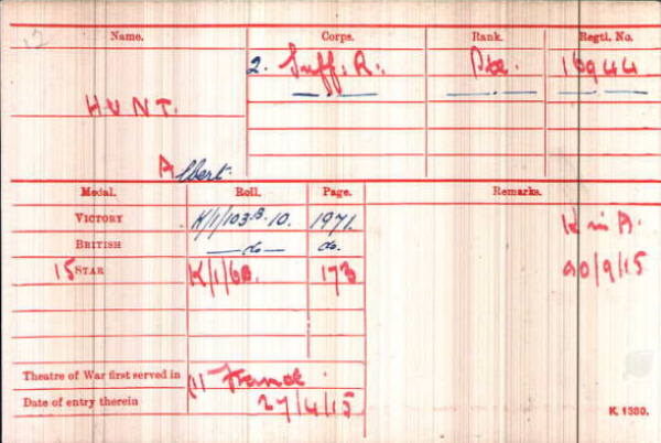 Albert Hunt was born in Rougham (1st qtr 1877 Thingoe 4a:576), son of Kate Ann HUNT. She married George PALFREY in 1878.