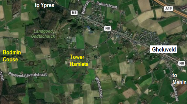 Mobilised on 7th June 1916 at Mill Hill, On 2nd October 1916 he was posted to the BEF and to the 7th Bn. Middlesex Regt. Transferred on 14th October to the 4th Royal West Kents, then the 7th Bn., No. 18842. On 8th March 1917 he was posted to the 11th Battalion. Wounded in the head on 3rd May 1917 and taken to Base Hospital at Abbeville, until 23rd May, when he went to Base depot at Etaples, returning to his battalion (11th) on 3rd June. His family moved to Moat Farm Cottages, Rougham In 1919 Army Form 5080 had living blood relatives as his parents at Moat Cottages, Rougham with his brothers Arthur, Herbert, Roland and Cyril [7] and sisters Evelyn at 25 St.John's Road, Sidcup, Kent and Lilian in Rougham. Brother Albert was with 11th Eastern Company,N.C.C., Canterbury and brother Alfred was with 239th Coy, Machine Gun Corps in Mesopotamia. The unit that brother Albert was in was one of the companies of the Non Combatant Corps. These units were for men who had elected not to engage in fighting but were willing to undertake various labouring duties. They served in all other respects as soldiers. In the main these units never went overseas. The 11th Battalion on 20th September 1917 were in the Ypres salient, at BODMIN COPSE ready for the assault on TOWER HAMLETS. At 5:40 am our barrage opened and the battalion advanced behind the 15th Hampshires. Despite the Hants battalion being held up and losing their officers, the combined battalions then went ahead and took their objectives. Casualties were made worse by the fact that the battalions on either side had not kept up, and enfilade machine gun fire was troublesome. The enemy tried a counter-attack at 2 pm but this was smashed by our artillery. By nightfall they were dug in, with the YORK and LANCS on the left and 20th Durham Light Infantry on the right. CWGC records have 47 killed on 20th, only 8 have known graves, the rest are all commemorated on the Tyne Cot memorial. The De Ruvigny entry seems to be in error, giving his death at Polygon Wood. This wood was some distance away, the other side of what is now the A19 and was attacked a few days later.