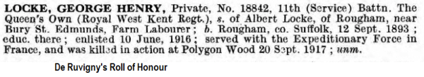 George Henry Lock was born in Rougham on 12th September 1893(4th qtr 1893 Thingoe 4a:717), son of Albert and Alice LOCKE (née COULTON)