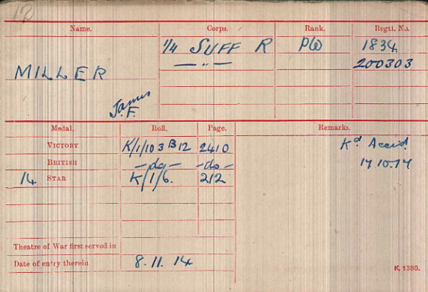 James Frederick Miller was born in Hurst, Berkshire on 8th February 1895 (2nd qtr 1895 Wokingham 2c:387), son of William and Fanny Jane