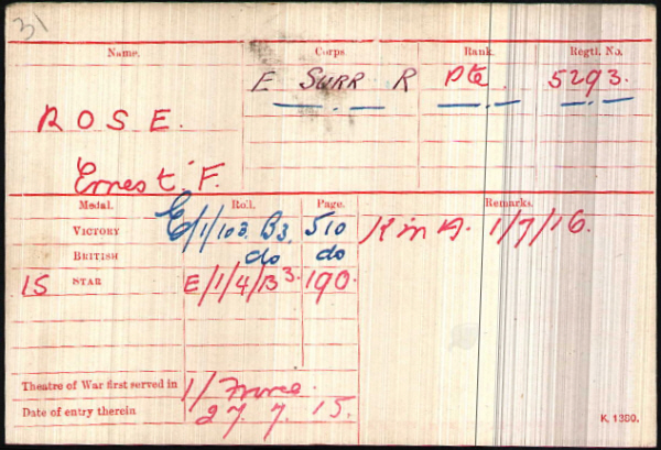 Ernest Frank Rose was born in Rougham (2nd qtr 1896 Thingoe 4a:788) son of Charles and Sarah ROSE (née SUTTON)