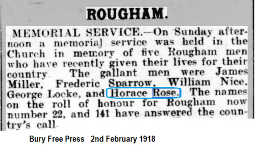 Horace Rose was born in Bradfield St George on 5th June 1898 (3rd qtr 1898 Thingoe 4a:824) son of Charles and Sarah ROSE (née SUTTON)