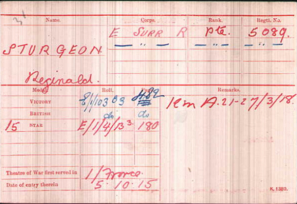 Reginald Sturgeon was born in Rougham (3rd qtr 1897 Thingoe 4a:806), son of Horace and Edith STURGEON (née JOLLY)