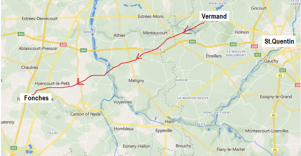 On 21st March 1918, the start of the German Spring Offensive "The Kaiserschlacht", the 9th East Surreys were at Vermand. By the 26th they had been forced back to Fonches, between Hallu and Hattencourt. By this time they had been virtually wiped out, under 40 men answering the roll call. There is no war diary for the 27th. From 27th to 8th April the remnants of the 9th East Surreys were attached to the 8th Royal West Kents. It was during this period, 21st to 26th March, that Reginald was killed, or died of wounds.