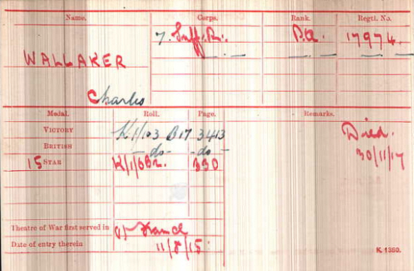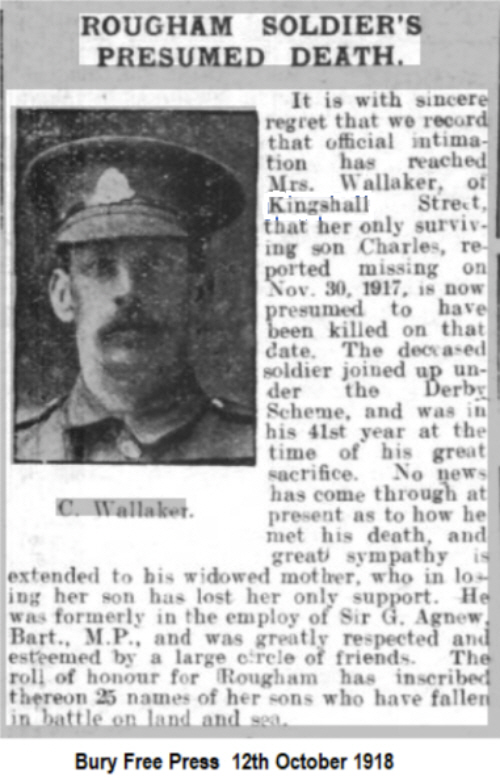 Charles Henry Wallaker (recorded as WALLIKER) was born in Rougham (1st qtr 1877 Thingoe 4a:573), son of Frederick and Margaret WALLAKER (née READ).