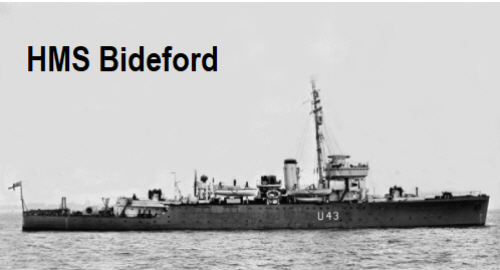 H.M.S. Bideford was a Shoreham class sloop, launched in 1931. She spent much of her time in the Persian Gulf and Hong Kong, returning to UK on the outbeak of war. In May 1940 she took part in the Dunkirk evacuation. On her first evacuation trip, on the evening of 29 May, Bideford was hit by a German bomb, which set off one of Bideford's depth charges, badly damaging the ship, and killing 28. The aft 40 feet of the ship's stern was blown off, with Bideford having to be grounded to avoid sinking. The minesweeper Kellett took off the surviving troops from Bideford, but despite the damage to the sloop, other troops later boarded Bideford. The Dragonfly-class river gunboat Locust towed Bideford back to Dover, the journey taking 32 hours and ending on 31 May.