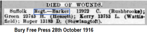 1901 census...Aged 5, he was at Rushbrooke with his father Arthur BARKER [28] farm labourer born Rougham; his mother Elizabeth [38] and sister Ada [2]. All except his father were born in Rushbrooke 1911 census...Aged 15, a farm labourer, he was at 22 Rushbrooke with his parents and sister Ada On the pension card his father was still at 22 Rushbrooke. |