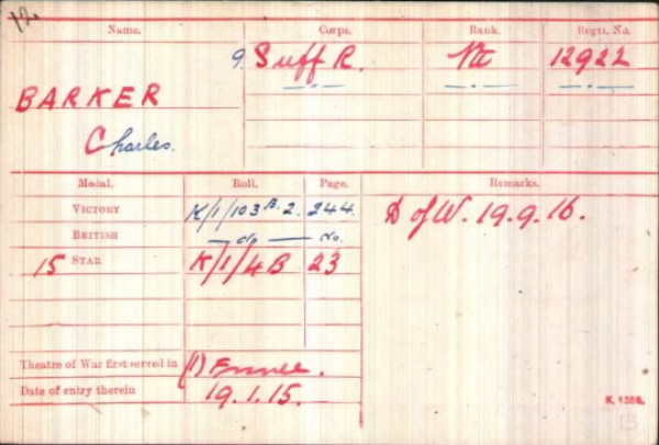 Charles Barker was born in Rushbrooke (3rd qtr 1895 Thingoe 4a:785), son of Arthur and Eizabeth BARKER (née COLEMAN)