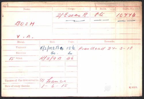 Victor Albert Bush was born in Ridgewell (Halstead Q2-1898 4A:701), son of James and Martha Emma BUSH (née RAWLING).