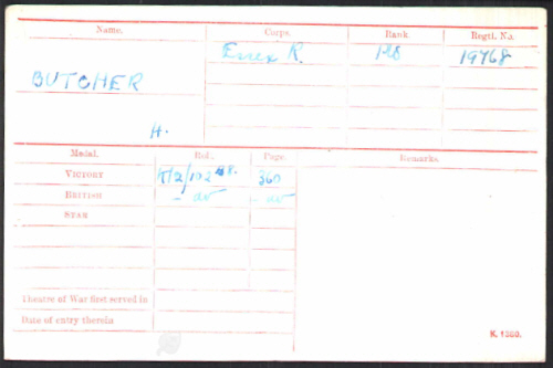 1891 census...Aged 2, he was at Mill Lane, Ridgewell with his father Alfred BUTCHER [26] farm labourer born Tilbury Juxta Clare and his mother Mary Ann [25] born Ridgewell. 1901 census...Aged 12, he was at Hall Lane, Ridgewell with his grandparents Charles DAINES [62] and Lydia [58] and his uncle Oliver DAINES [26] all born in Ridgewell. His parents were at Drury Lane, Ridgewell with his brothers James [9] and Charles [6] and sister Ivy [2], all born in Ridgewell. 1911 census...Aged 22, a farm labourer, he was still at Hall Lane, Ridgewell with his widowed grandmother Lydia DAINES. His parents were at Green View, Ridgewell with his brothers James and Charles (both farm labourer) and George [3]; sisters Ivy and Florence [9]. The new siblings born in Ridgewell. All six of Mary's children survive. His brother James served in the Essex Regiment, Labour Corps and Northamptonshire Regiment, from his disciplinary records a far from ideal soldier, but he survived the war. |