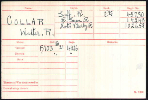 1901 census...Aged 2, he was at Chapel Green, Ridgewell with his father Walter COLLAR [27] farm labourer born Ridgewell; his mother Mary [25] born Tilbury Juxta Clare; sister Emily [1] born Ridgewell 1911 census...Aged 12, he was at Tilbury Green, Tilbury Juxta Clare with his parents (father now a shepherd) , sister Emily Mary and brothers John [8] and Charles [4]. His brothers were born in Ridgewell |