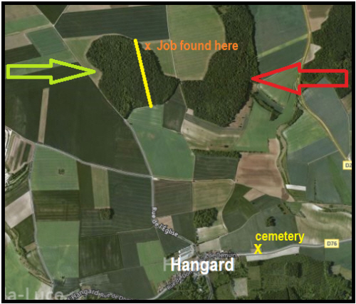 He died during the battle raging SE of Amiens in the German Spring Offensive when the Germans came very close to breaking through to Amiens. The war diary has:- 26/4/18- 1 am - Bn dug in by 3:50 am. Considerable enemy shelling on this area. Bn frontage was 600 yards from U.15.b.7.5.inclusive to U.15.d.6.2. inclusive. Dispositions in front line 2 Coys, C on right, B on left. D Coy acting as moppers up and in close support, A Coy in reserve. One platoon of A Coy was detailed to keep liaison with troops of Moroccan Division on the left. The objective of the Bn was road running through western and eastern portions of BOIS DE HASNGARD in U.17.a and c. Zero hour 5.15 am Troops moved forward under a most indifferent artillery support. There seemed to be no barrage on the Bn sector and very few shells fell on the wood. The leading Coys suffered considerable casualties from hostile machine gun fire. Shortly after zero 3 British tanks moved toward the objective but did not locate a German strong point at the northern edge of the wood from where most of the machine gun fire seemed to come. The Bn was considerably decimate, dug in on track running north and south through the wood at U.16.b.2.4. to U.16.d.3.5. This line was consolidated and touch was established with the 7th Queens on our right and Moroccan Div on the left. Casualties 12 Officers 201 OR. Strength of Coys 60 to 70 ORs During the night 26/27 our line was reorganised. CWGC records give 76 all ranks killed, 54 of them with no known grave. In 1923 Job and others who were buried initially at 62d.U.16.b.4.3., identified by crosses, were moved into Hangard Communal Cemetery extension |