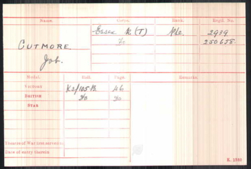1901 census...Aged 3, he was at Chapel Green, Ridgewell with his father Job CUTMORE [37] stockman; his mother Julia [37] born Litte Yeldham; sisters Kate [13], Eva [10] and Clara [5]; brothers Victor H. [11], William [9], Frank [7] and Wince [1]. All except his mother were born in Ridgewell. 1911 census...Aged 13 a farm labourer, he was in Ridgewell with his parents (father now a smallholder); sister Minnie [8] born Ridgewell; brothers William and Frank (farm labourers) and Wince. All eleven siblings survive. Brother Wince joined the Scots Guards in May 1918 and survived the war.. His brother Frank was killed in 1917 in Palestine in the Essex Regiment. see here |