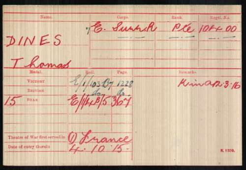 Thomas Dines was born in Langford, Beds (Biggleswade Q1-1896 3B:851), son of Joseph and Harriett DINES (née WILLIAMSON).