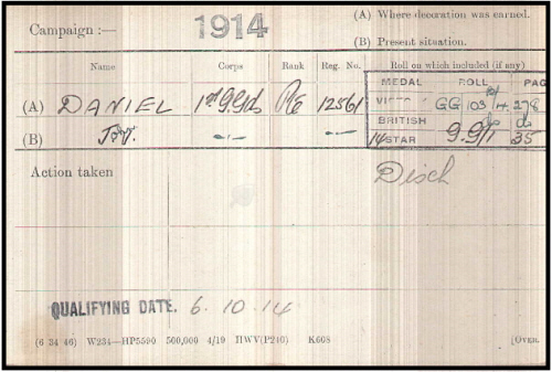 1901 census...Aged 15, a baker's assistant, he was at Regent Street, Stowmarket with his widowed mother Alice M. [37] born Bury St Edmunds; sister Rebecca Maude [10] and Brother Henry [7]. The three children are recorded as born Parkside, South Australia. Parkside is an inner southern suburb of Adelaide, next door to Eastwood. His father died on 8th October 1899 at Elizabeth Street, Eastwood, Adelaide, Australia in 1899 after a long and painful illness (Adelaide Chronicle), hence the return of Alice and her children to England. His mother married Charles ROBINSON in Stowmarket Q3-1901. 1911 census...Aged 25, a police constable, he was lodging with six other constables in Bury St Edmunds with Police Inspector Frederick BRUNNING and his family. On 26th September 1911 he married Florence May TASKER [8-7-1887(born Nuthurst, W.Sussex) at St John's Church, Bury St.Edmunds. They lived at No 15 The Green, Risby in 1915. They had two sons, Victor Thomas DANIEL on 2nd November 1913, who died in 1916, and is buried with his father, and John Louis (3-8-1916-to-1992). The address for his widow was 103 Constantine Road, Hampstead NW3. Thanks to "yekepa" on Rootschat for much of the above |